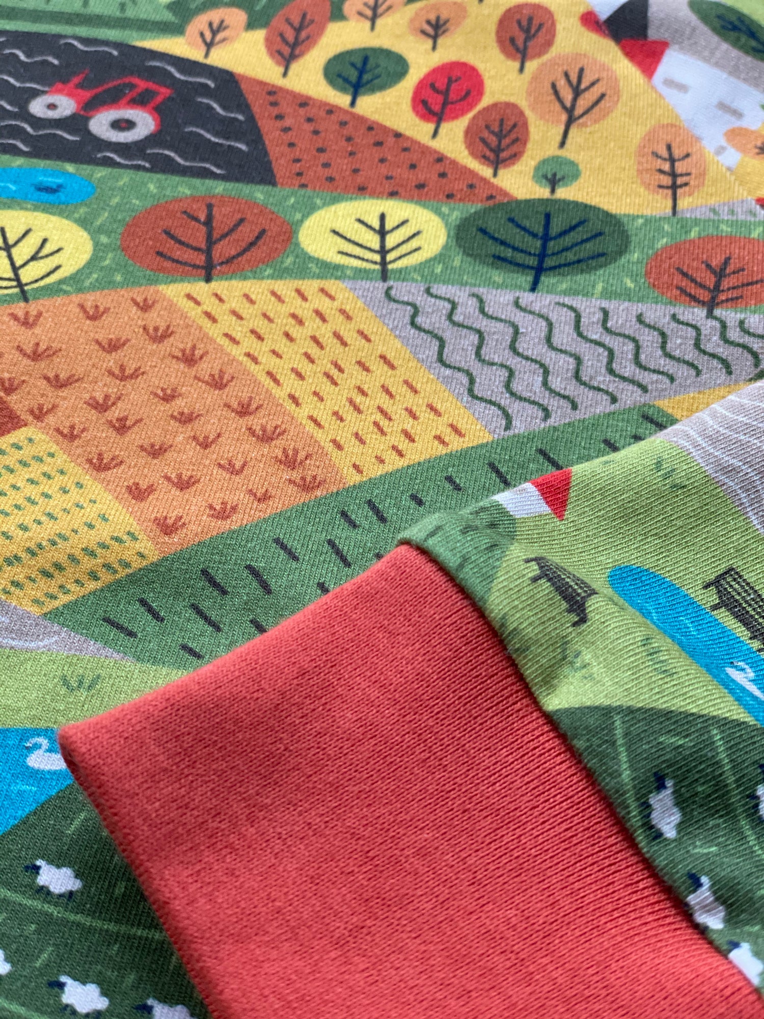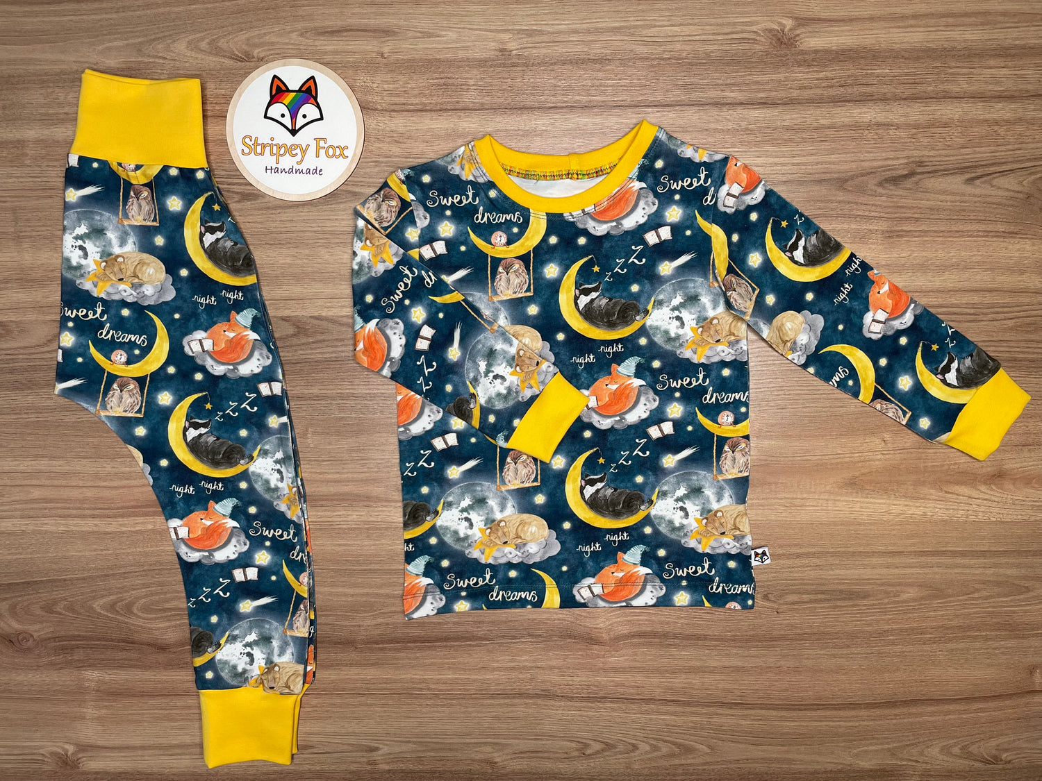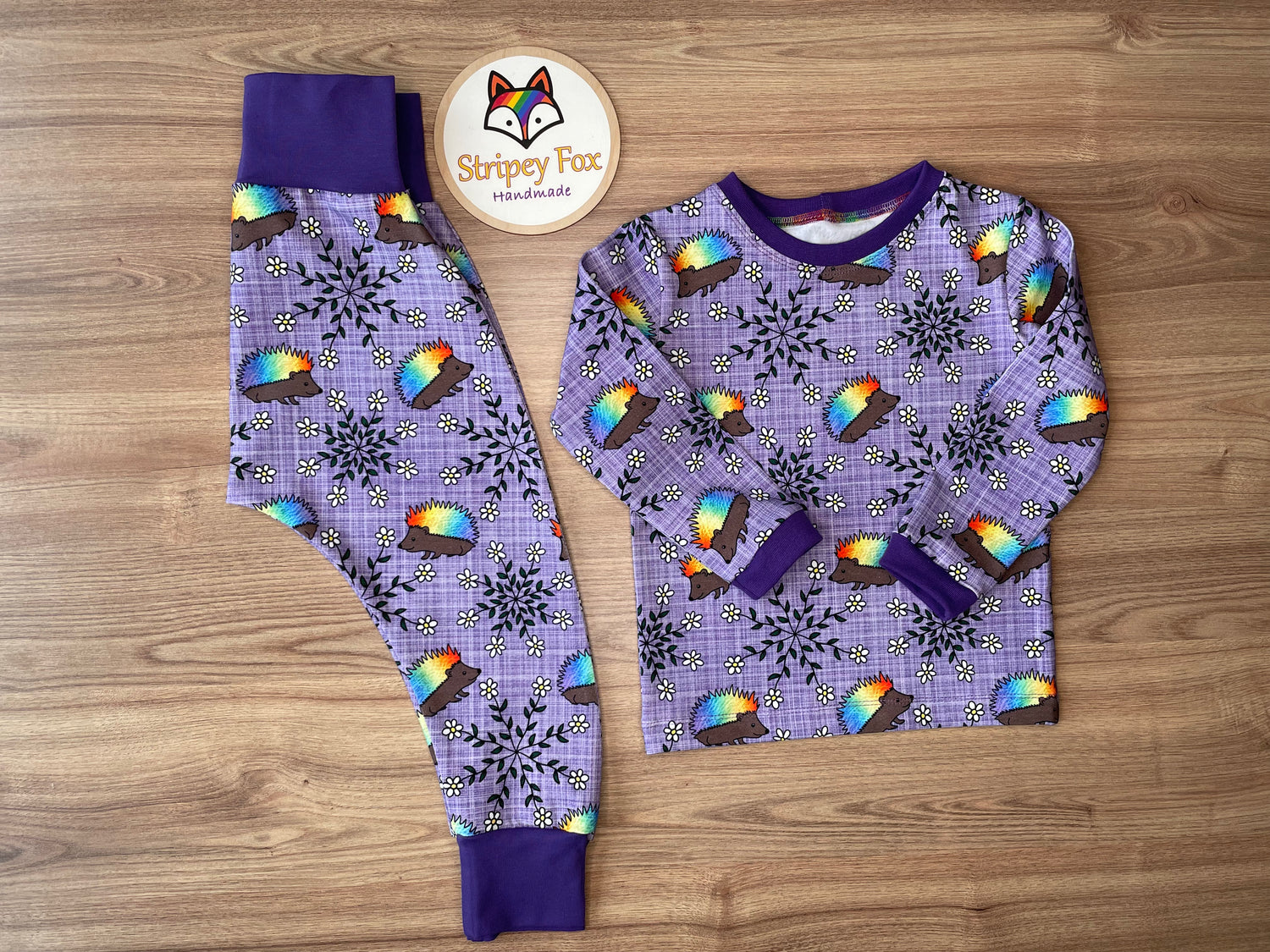 These matching sets are made with matching a top and bottoms, with arm and ankle cuffs. They have a yoga waist band on the harems and the waistband of the top is hemmed. They are made from 95% Cotton, 5% Elastane cotton jersey. The harem bottoms are ideal for fitting comfortably over a disposable nappy or large boosted cloth nappy.