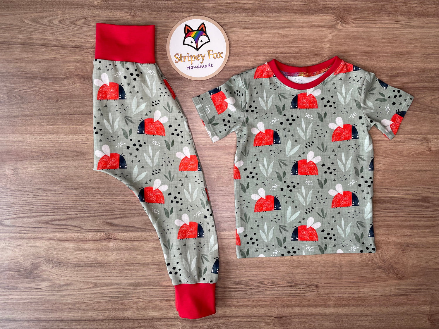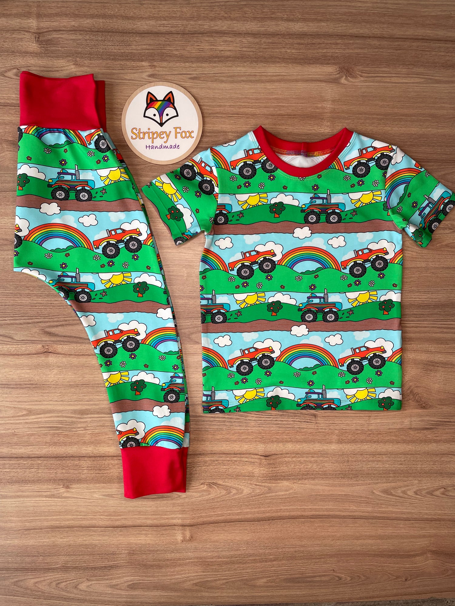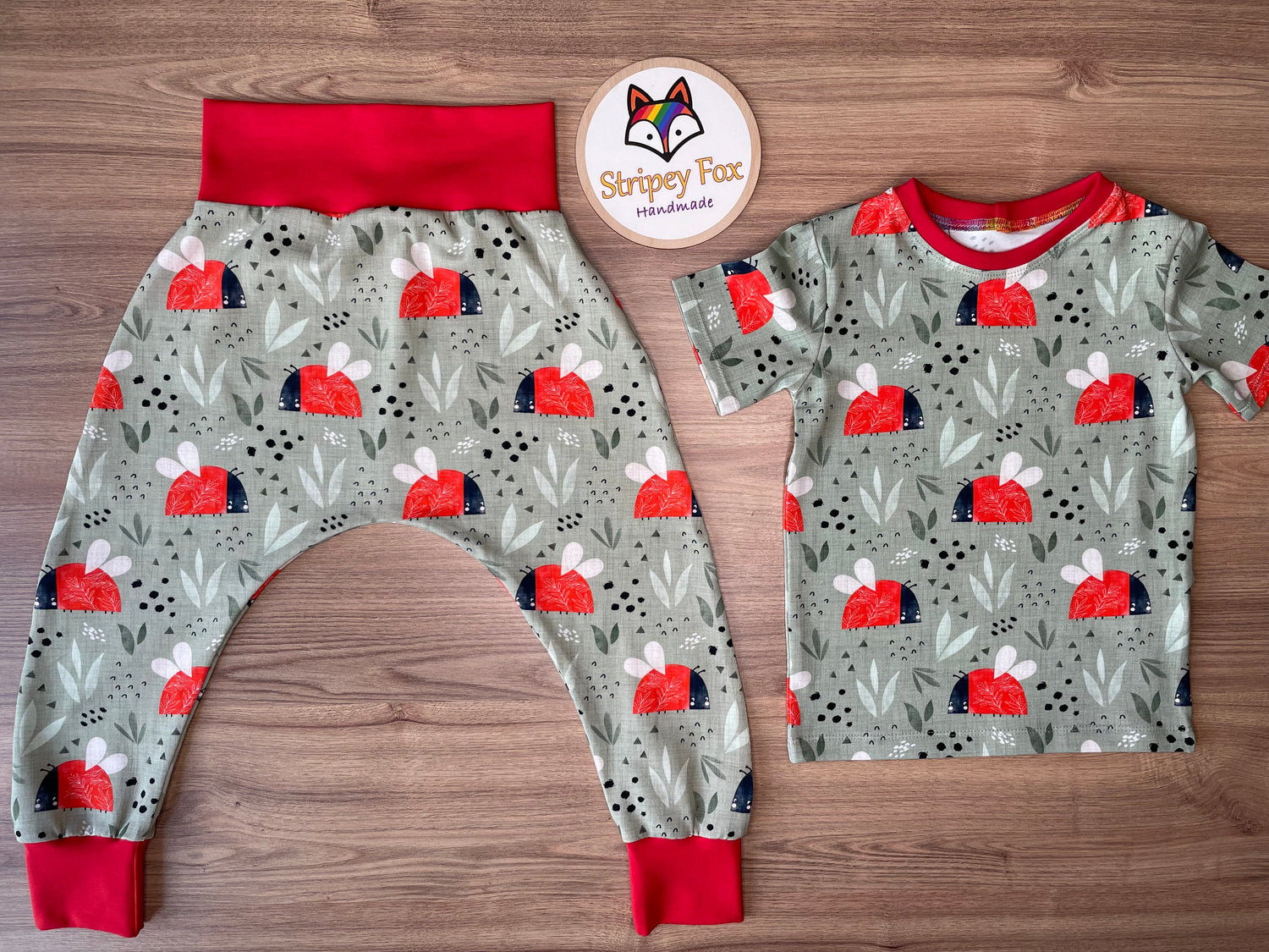 Handmade Children's lounge set with short sleeve T-shirt and long leg harems.