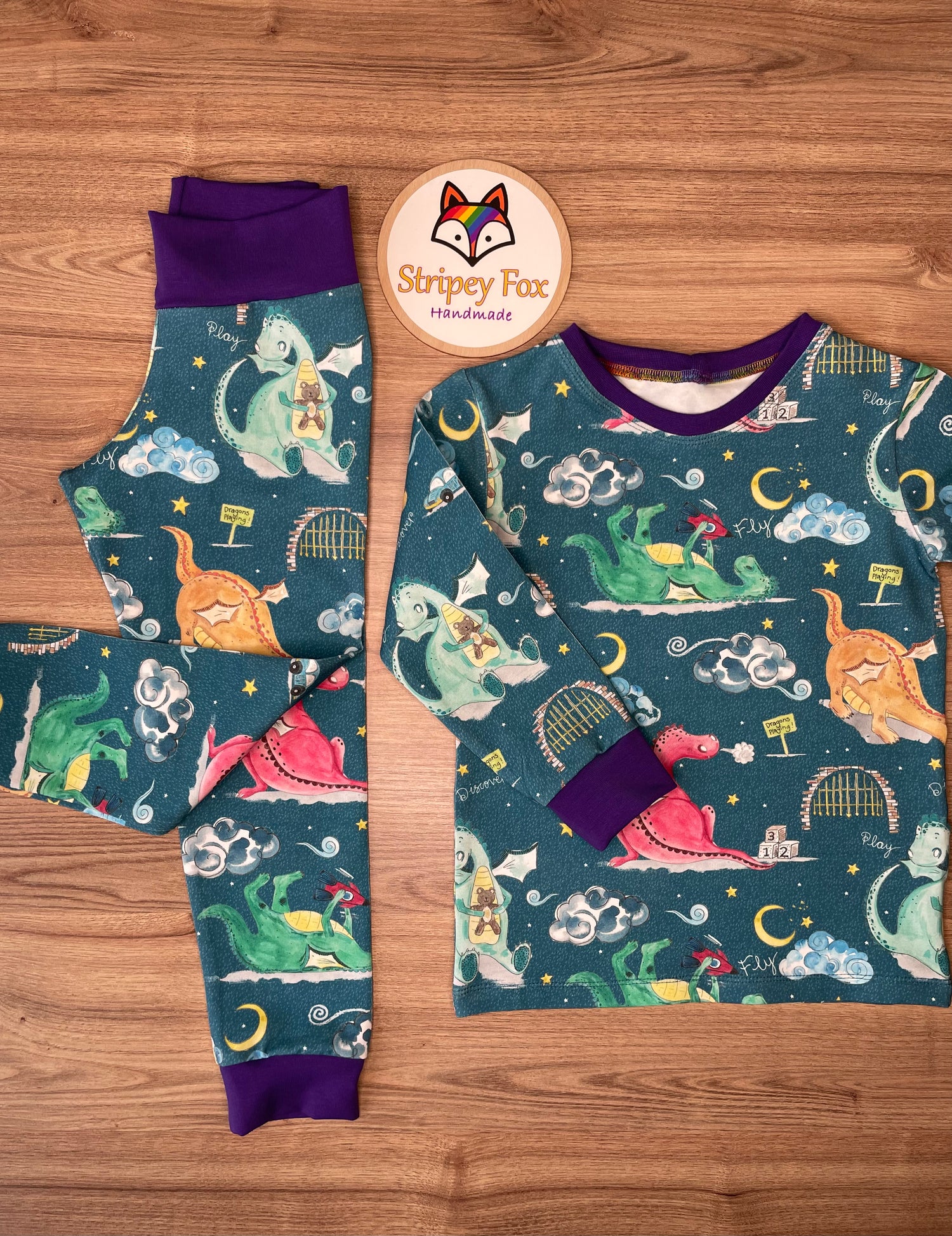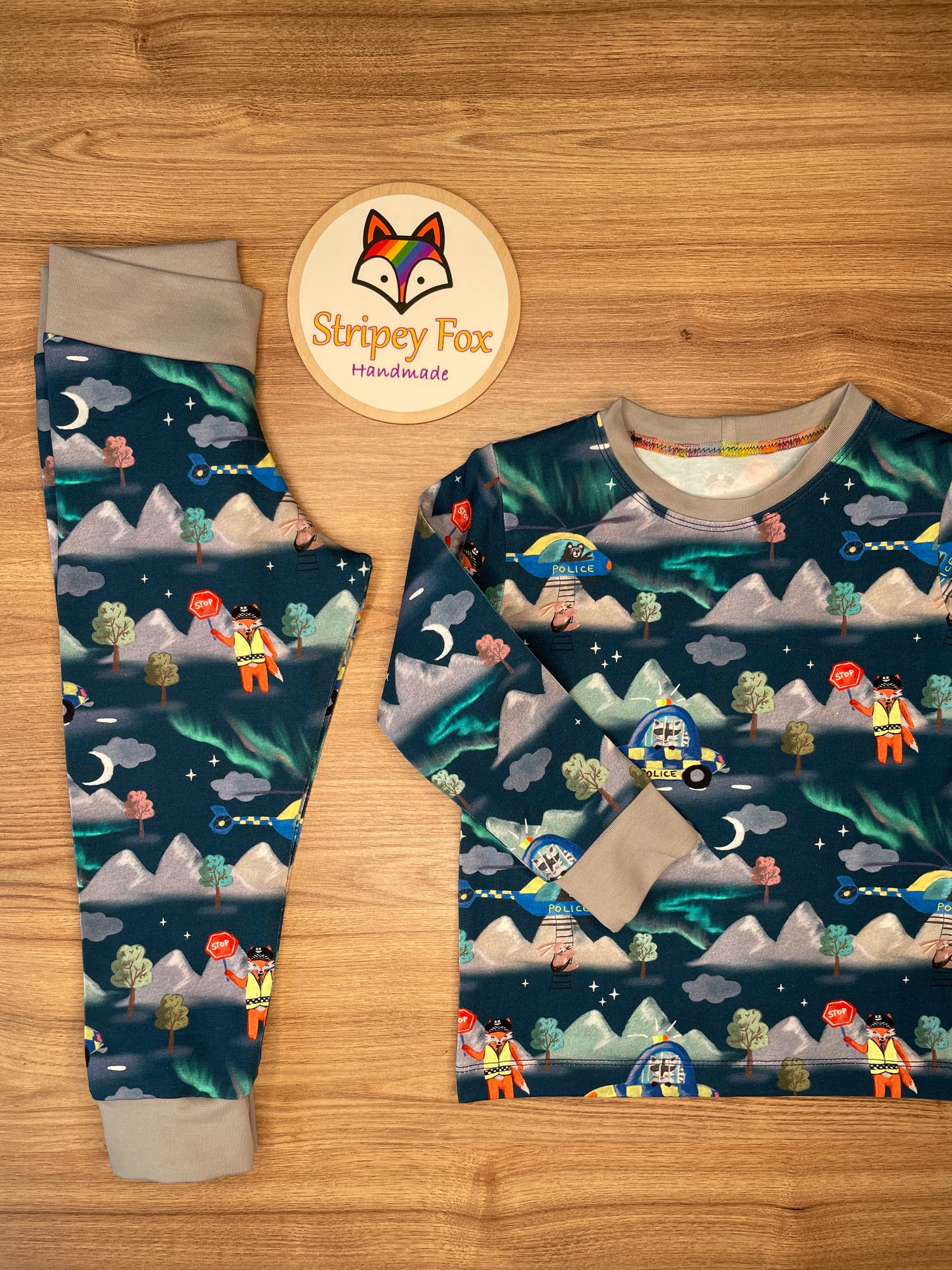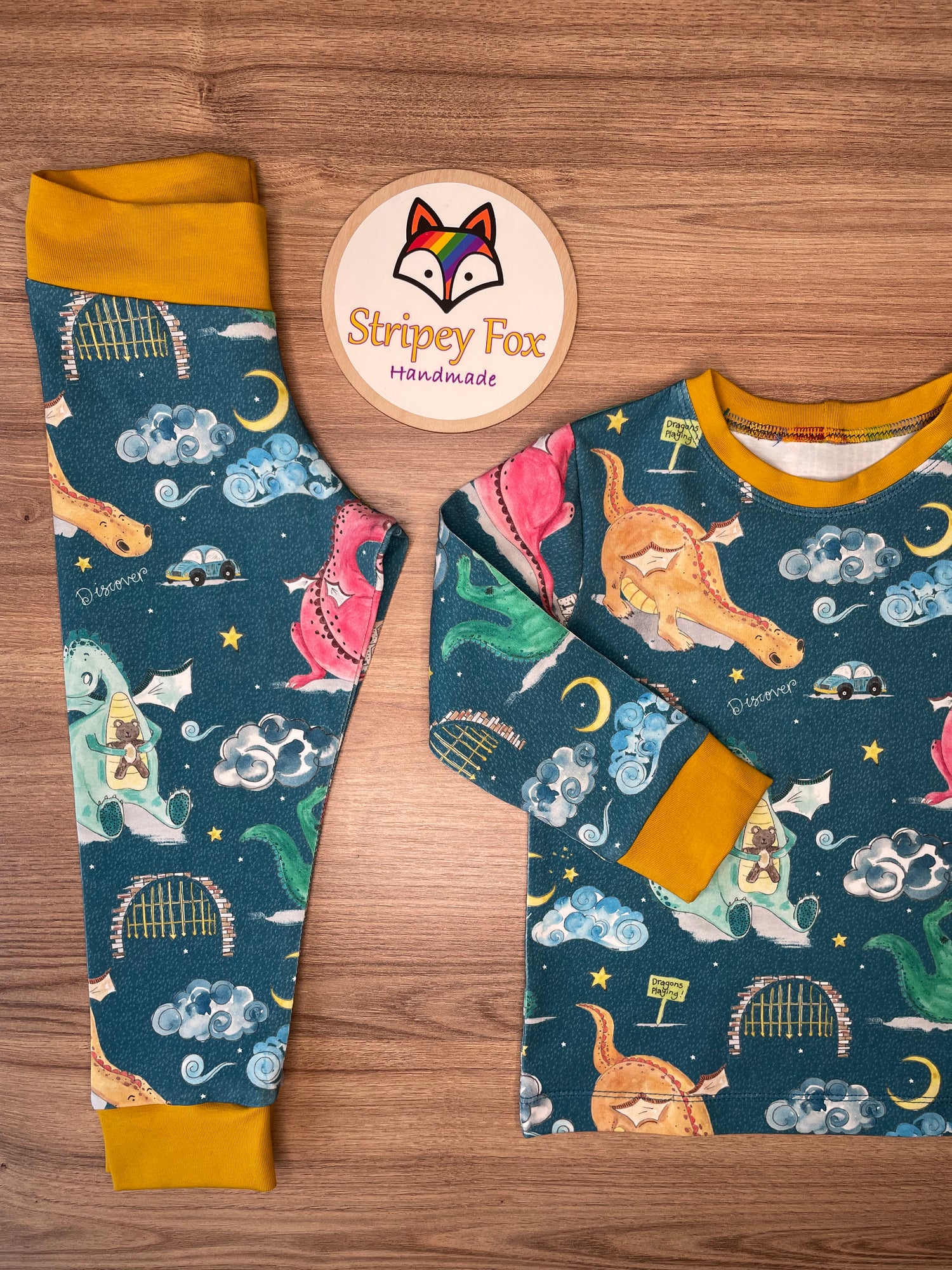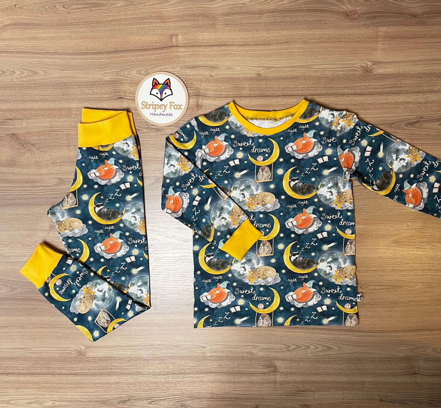 These matching sets are made with matching a top and bottoms, with arm and ankle cuffs. They have a jersey waistband on the leggings and the waistband of the top is hemmed. They are made from 95% Cotton, 5% Elastane cotton jersey.