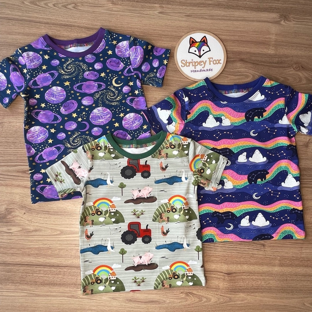 Handmade Baby and Children's T-shirt made especially for you in a variety of vibrant, fun prints.