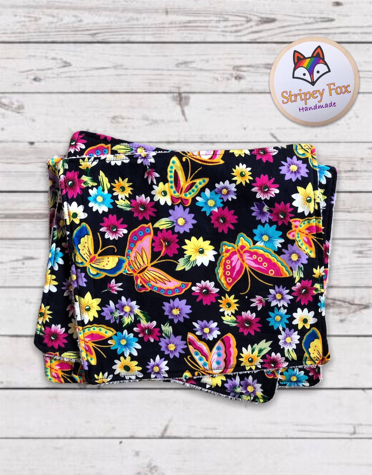 Set of 5 or 10 zero waste fabric reusable kitchen towels in the black floral butterfly print with white bamboo towelling.