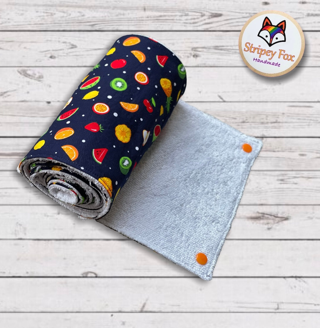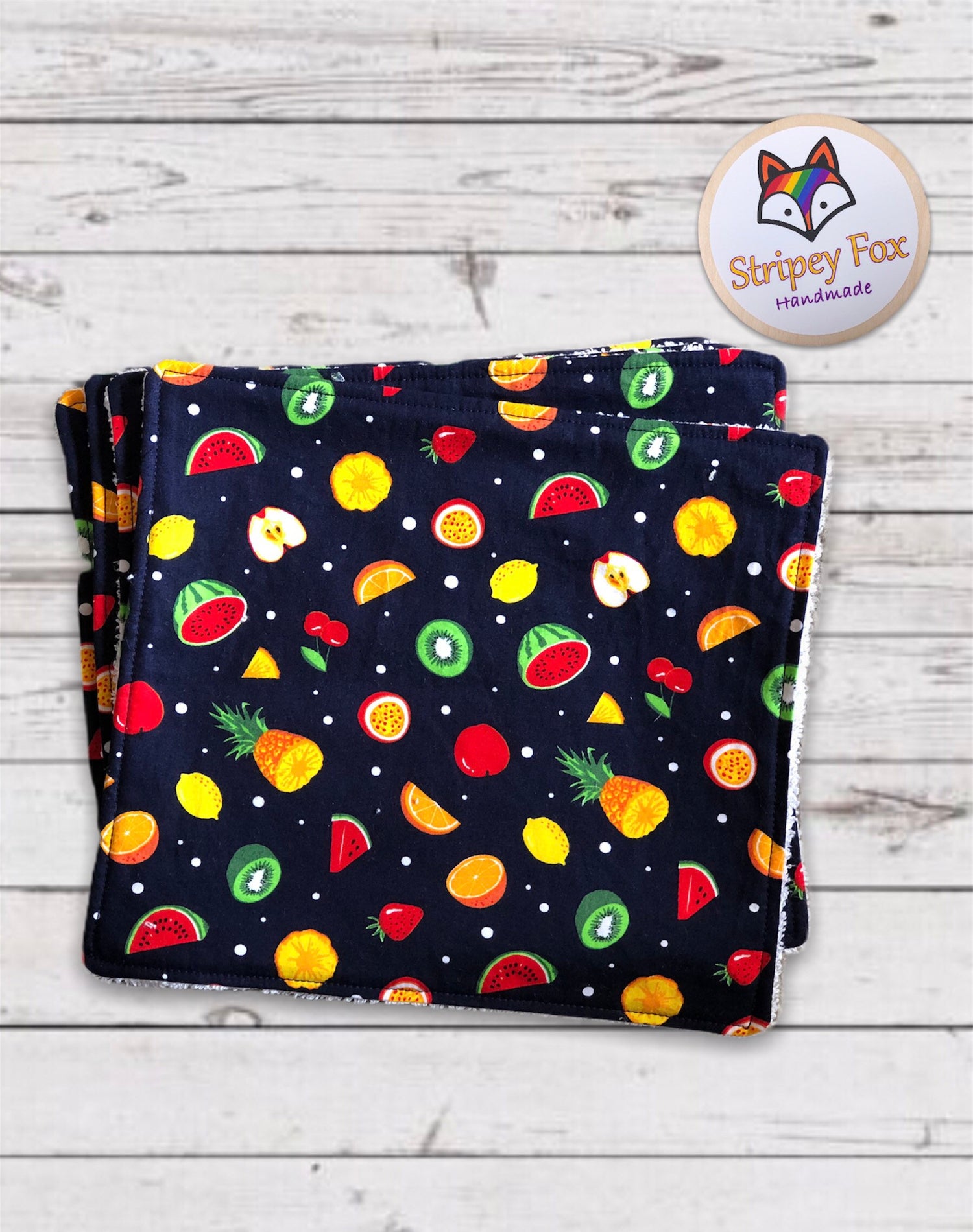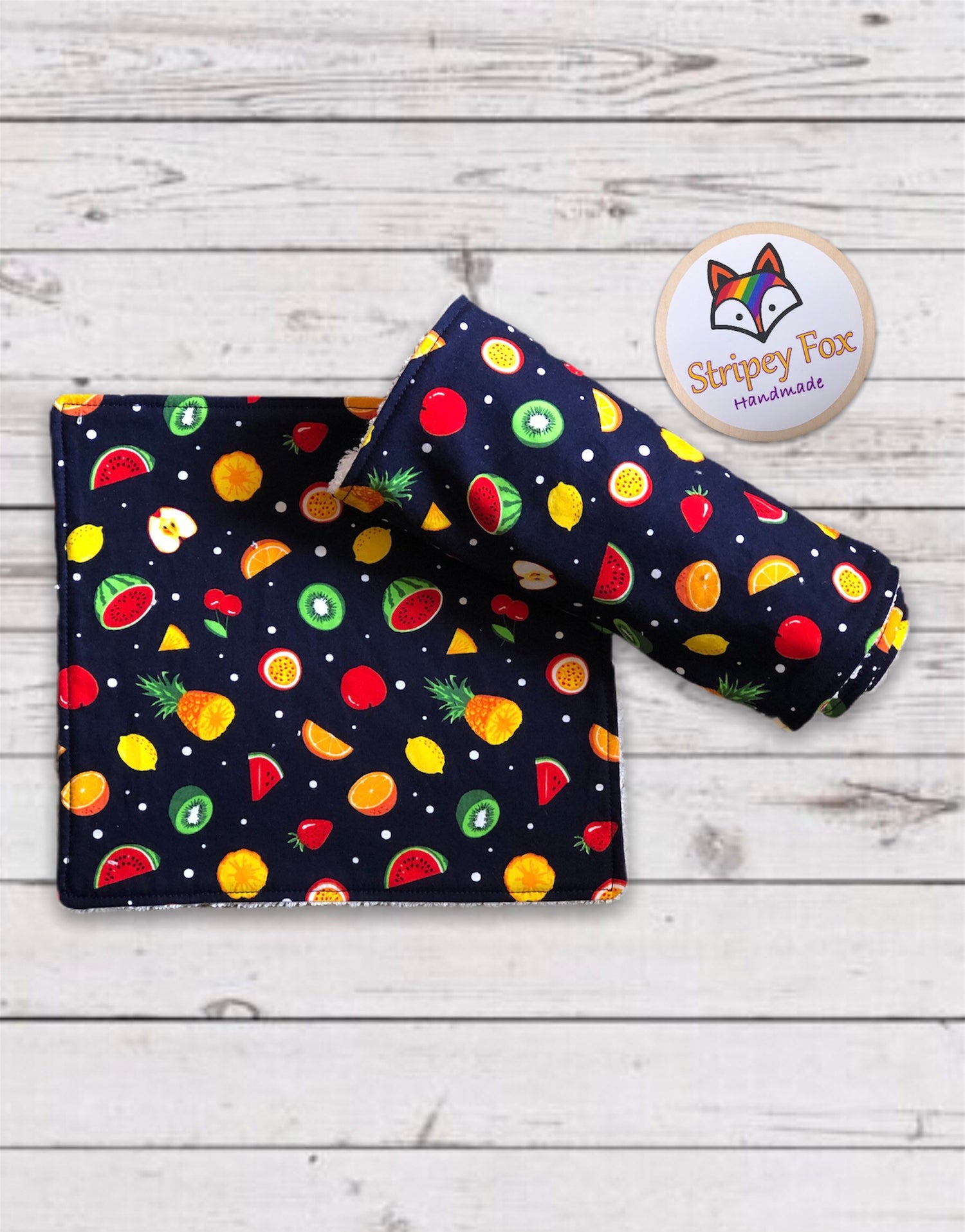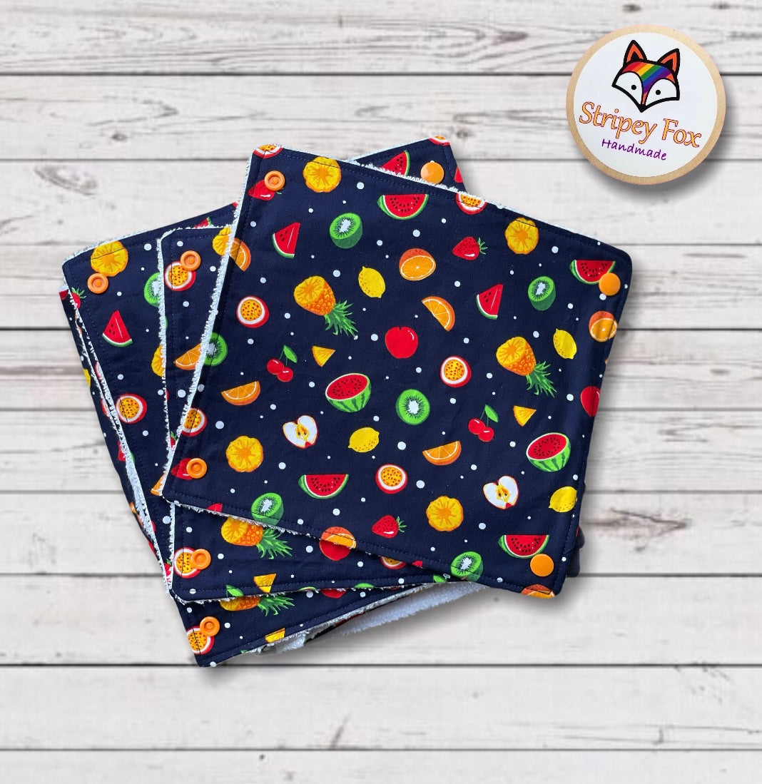 Set of 5 or 10 zero waste fabric reusable kitchen towels in the navy blue Fruit Salad print with white bamboo towelling.