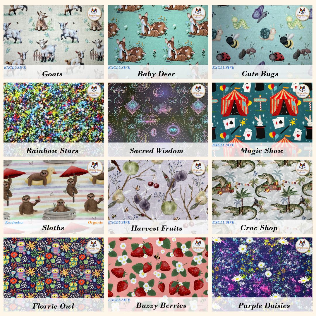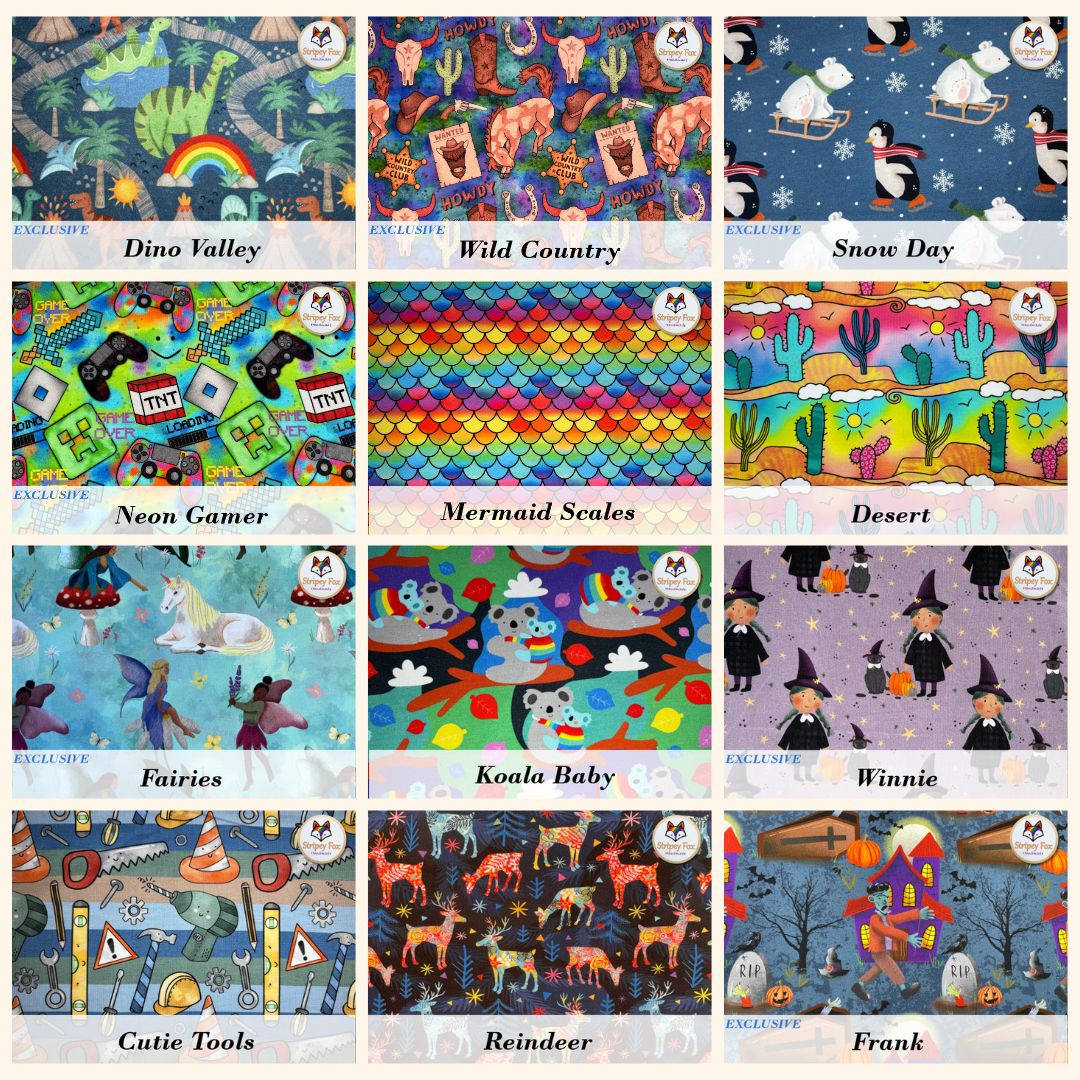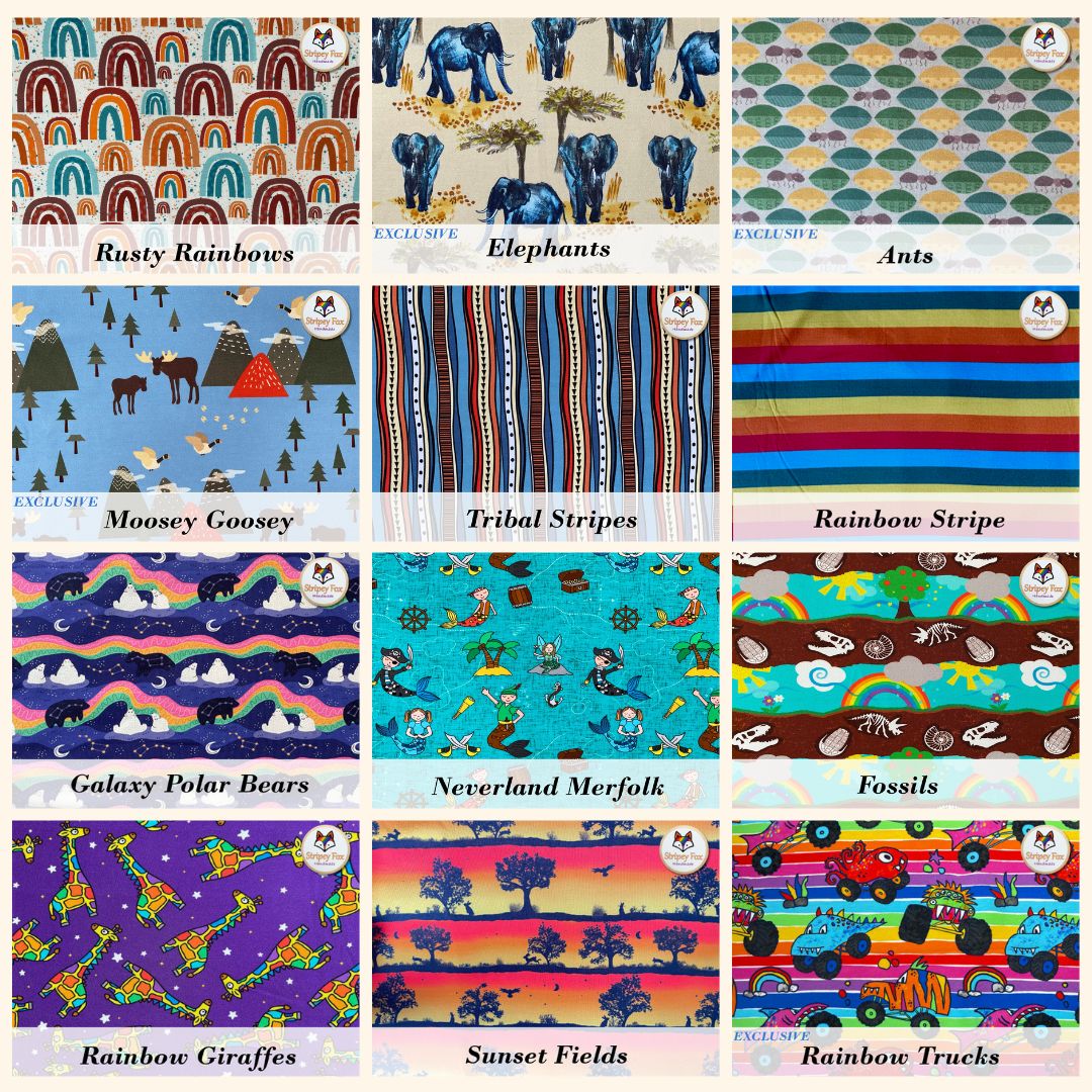 Waistband and cuffs will be added in the same fabric where available. On some occasions it may be required to use a solid colour. In this case a random colour will be chosen from suitable matches.